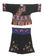 ,外套青色滿肩馬褂,腰系桃花兜,并配撤穗荷包,下著青色寬腳褲,腳穿白布襪子和天官云頭鞋。婦女頭上蒙白色繡花帕,兩耳垂環(huán),手戴鐲子或戒指,外套繡花圍裙,用繡花飄帶系著,右上胸佩掛三吊或五吊銀質(zhì)牙簽。下著蘭色寬褲,腳纏白色裹腳布,穿繡花尖尖鞋。無(wú)婚女性則挽“簪巴”,挽于腦后的稱“粑粑”,挽于頭頂?shù)姆Q高把簪,簪上套有網(wǎng),橫插簪子;兒童衣服多繡花,外圍肚兜,頭戴虎頭鼓針菩薩帽,頸戴“項(xiàng)圈”、“百家鎖”等,手腕套有銀圈,上系小吊,吊上有錘、鈴、鞋、斧、簽等。