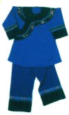 邊。男捆腰帶,女套繡花圍裙。頭上均包青布帕或絲帕,男帕左方垂一節(jié)過(guò)耳,婦女全包頭。未婚閨女留長(zhǎng)發(fā)扎辮,用紅頭繩扎上下兩端,額前前留“劉海”。已婚婦女挽上發(fā)管,別簪,插銀首飾。褲子多為青、藍(lán)色、上結(jié)白布褲腰,褲腳短且大。青壯年男子打綁腿,女褲以對(duì)襯色布加邊,上綴三條均等的梅花條,腳上穿青布瓦鞋,包白色裹腳布。若遇喜慶節(jié)日或走親訪友,則另有一番梳妝打扮,如加佩牙簽、銀牌等。