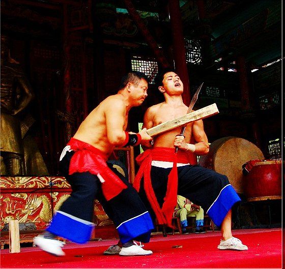 大庸氣功 大庸氣,堪稱武林奇葩,曾為祖國贏得聲譽(yù),海內(nèi)外享有極主名望。 大庸氣功是大庸各民族特別是土家族傳統(tǒng)體育項(xiàng) 目之了,分健體氣派、武術(shù)氣功兩類。前者有“返還 功”、“馬王推氣功”、“少林達(dá)摩醫(yī)療保健氣功” 等;后者有靜坐、壁虎、靈子、二指彈、碎石、松靜 、硬氣、五禽、五陽功等,尤以硬氣功著稱。大庸硬 氣功,歷史悠久,漢代相單程,明代覃后,清代劉明 燈,當(dāng)代湯子模、周鐵鞭、杜心武、趙繼書等都具有 超人硬氣武功。大庸土著民族在漫長的反征服、反壓 迫斗爭,博采武當(dāng)、少林南北派、昆侖派眾家武林精 華,創(chuàng)造出獨(dú)此一家的大庸硬氣功。 據(jù)傳,大庸硬氣功鼻祖是楚國鬼谷子?!?a class="insidelink" href="http://www.larbertelectrician.com/cityinfo/15580531721.html" title="永定區(qū)">永定縣 志》有關(guān)鬼谷子隱居天門山鬼谷洞潛心學(xué)《易》、傳 授方術(shù)的記載。到清代有武林高手朱茂嶺,隱居三岔 村北芭蕉灣洞,研究鬼谷氣功之術(shù),后收西溪坪胡口 子、余世萬(即“余通人”)為徙,傳其衣缽。余通 人將武術(shù)氣功系統(tǒng)整理,發(fā)揚(yáng)光大,播名于世。 新中國成立后,黨和政府十分重視民間氣功發(fā)掘 整理,并正式列為體育項(xiàng)目加以普及發(fā)展,今日大庸 市習(xí)練硬氣功達(dá)數(shù)萬人眾。永定區(qū)官黎坪村世有“硬 氣功之鄉(xiāng)”盛譽(yù),該村男女老幼,練功已蔚成風(fēng)氣, 其武師趙繼書,1979年先后參加全省和全國武術(shù)大賽 ,均獲一等獎(jiǎng),受到國家體委重視,同年7 月趙繼書 專程到北京給中央領(lǐng)導(dǎo)同志匯報(bào)表演。嗣后,隨同中 國武術(shù)代表團(tuán)和國家領(lǐng)導(dǎo)人先后兩次出國,到盧森堡 、意大利、比利時(shí)、羅馬尼亞、馬其他和東南亞等國 家訪問。他表演的臥刀碎石、頭頂開石、雙鳳灌耳、 頭碰石柱、叉尖推磨等精彩節(jié)目,博得外國友人好評 。盧森堡一位榮獲國家獎(jiǎng)牌的武士,看了表演后連夜 來到中國大使館,將自己珍藏多年的獎(jiǎng)牌贈(zèng)送給他; 盧森堡國王主動(dòng)熱情走上臺(tái)與趙繼書熱情擁抱,連連 稱贊:“了不起!了不起!國際氣功大師!”并把珍 藏紀(jì)念章一枚贈(zèng)送給趙繼書。一位法國朋友十分贊賞 說:“中國的氣功,稱為全人類的寶貴財(cái)富,是有科 學(xué)道理的。”自此,大庸硬氣功譽(yù)滿全球。湖南瀟湘 電影制片廠專門拍攝了彩色紀(jì)錄片《大庸氣功》。 大庸硬氣功共有二十多個(gè)項(xiàng)目,最有影響的是: 腹臥鋼叉 由二人在地面扶住一根叉尖朝上的三 股鋼叉,叉尖猁鋒利,然后一個(gè)俯身叉尖,尖抵腹部 ,待其四肢平展懸空,扶叉二人轉(zhuǎn)動(dòng)鋼叉,謂之推磨 。表演時(shí),要求臥叉者運(yùn)氣于腹,氣意集中,稍有大 意,叉即穿腹而過。 臥刀破石 先固定兩把大刀,刀口朝上,臥刀者 運(yùn)氣后,由其他人抬臥于刀口上(有仰臥、俯臥兩種) ,然后在臥刀者腹部或背部置一碩大石條(約數(shù)百斤) ,一人或兩人輪大鐵錘狠擊石條直至斷裂破碎為止。 釘?shù)洞财剖?地上倒一層碎玻璃片,一人仰臥其 上;然后腹上置釘床,又一人仰臥釘床上,再于第二 人腹上置釘床,第三人仰臥刀床上,腹部上壓一塊數(shù) 百斤大條石,由人掄錘狠砸,至石破為止。 銀槍刺喉 用一根兩頭安有鋒利槍頭的鋼槍,抵 置兩位表演者喉部,然后相對發(fā)力,至槍桿抵成彎弓 形而喉部安然無恙。 徙手?jǐn)嗍?表演者將堅(jiān)滑如鐵一塊卵石置于石凳 (地)上,然后運(yùn)氣于掌或指擊斷(碎)卵石。 踢腿斬石 表演者運(yùn)氣于腿,以腿踢斷石條。一 般可踢斷15公分以上厚度的麻石條或青石條。 胸部打刀 將鋒利大刀刃口置于胸部肌肉上,用 一根拳頭粗木棒猛擊刀背,至棒斷而胸部無傷。 新中國成立以來,大庸民間武術(shù)與民族體育逐漸 融為一體,發(fā)揮著提高人民身體素質(zhì)、弘揚(yáng)中華武術(shù) 傳統(tǒng)和增進(jìn)國際友誼重大作用。除硬氣功外,還有數(shù) 十種武術(shù)形式散見于民間武術(shù)體育活動(dòng)之中。如打飛 棒、扭扁擔(dān)、抵搭斗杠、擠油渣、甩抱腰、舉石鎖、 板牛角(一種斗牛形式)等等。其特點(diǎn)是因地制宜, 不分場地,凡田園地角院壩集鎮(zhèn),都是習(xí)武練功、開 展活動(dòng)的處所,頗具泥土氣息。擬或以生活中某些動(dòng) 作和動(dòng)物的某種形態(tài),稍加模仿演繹,便成某一獨(dú)特 武術(shù)形式。如天門武術(shù)功夫大師余道人所創(chuàng)造的“宮 天梳”、“巖燕樸天門”等;也有就地理特點(diǎn)創(chuàng)造某 種武功形式的,如“蕩藤”等。 以上部分圖片均來自互聯(lián)網(wǎng),出處不詳,請作者與本站聯(lián)系。 |