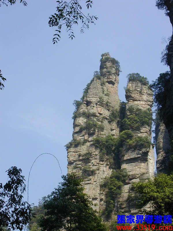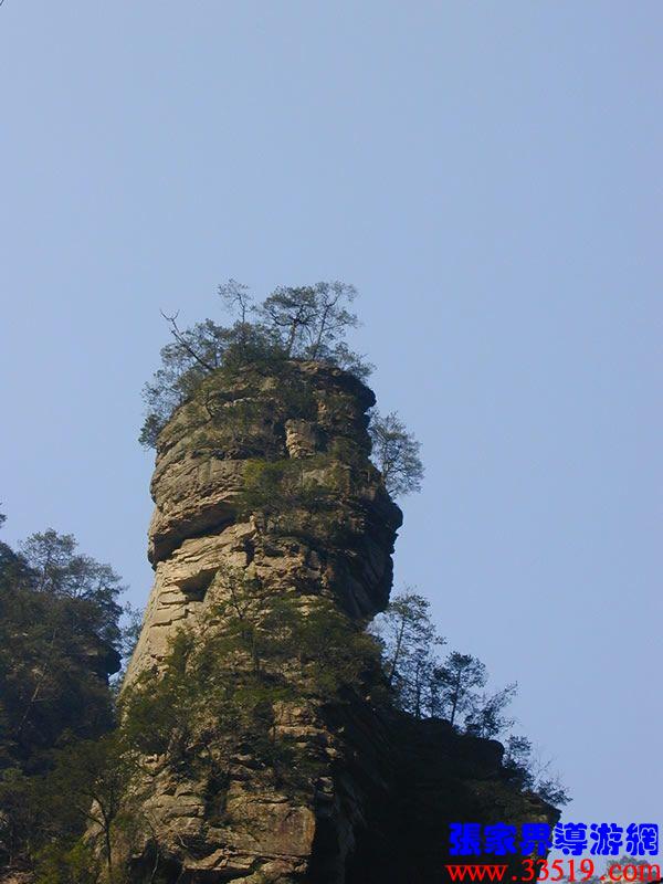 (金鞭巖、神鷹護(hù)鞭)如果要問張家界國家森林公園的標(biāo)志景點(diǎn),答案是現(xiàn)成的:金鞭巖。早在清代中期,一些文人就把張家界的峰林及百丈峽列入“永定八景”。其一叫“危峽啼猿”;其二叫“層巖涌塔”:“縣西二十里青崖山,其前五山并立,層峙如浮圖。中一峰更峻拔,上插宵漢,晴輝雪積,最擅奇觀。”這里說的“其中一峰”,指的金鞭巖。八大景點(diǎn)張家界占其二,可見先人是有眼力的。金鞭巖相對高度380多米,拔地而起,直插云霄,無論你遠(yuǎn)看近看,正看側(cè)看,都是一根刺破青天的長鞭!在金鞭巖左側(cè)的那座巖峰,大家看多像一只兇猛的老鷹,勾嘴瞪眼,雙翅略展,時刻警覺地守護(hù)著金鞭,人稱“神鷹護(hù)鞭”。