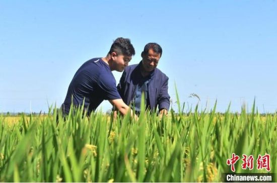 金秋時(shí)節(jié),臺(tái)胞林駿睿(左)與吉林農(nóng)民楊萬(wàn)芳在稻田里觀察水稻。 高龍安 攝