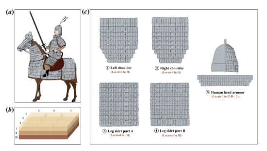 本研究對象是目前世界上已知最早的可復(fù)原甲騎具裝實物—出土于遼寧北票喇嘛洞墓地的珍貴遺存。研究結(jié)果表明,這套甲胄從結(jié)構(gòu)設(shè)計到材質(zhì)加工均體現(xiàn)出高度的技術(shù)成熟度,證明鮮卑在公元4至5世紀已具備先進的甲胄制造能力;而古蛋白質(zhì)組學(xué)分析首次證實,甲胄制作中使用了羊源材料——這一發(fā)現(xiàn)填補了古代游牧民族甲胄材質(zhì)研究的空白,為探討當(dāng)時草原地區(qū)的動物資源利用、畜牧業(yè)發(fā)展與軍事手工業(yè)的關(guān)聯(lián)提供了直接證據(jù)。