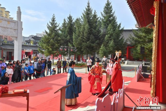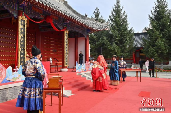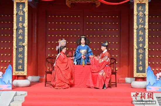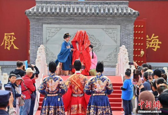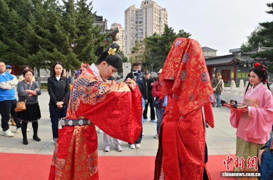 10月7日,吉林長春文廟舉行了一場明制漢婚沉浸式展演。漢服愛好者依次呈現(xiàn)奠雁、同牢、合巹等傳統(tǒng)禮儀,生動(dòng)還原明代婚俗,F(xiàn)場通過流程講解與道具展示,解讀禮儀背后古人對婚姻與美好生活的寄愿。中新社記者 張瑤 攝