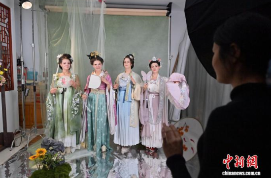 11月9日,在吉林長(zhǎng)春的一家漢服體驗(yàn)館,德國友人身著精美漢服拍攝寫真。近年來,漢服日益受到外籍人士青睞。該館已為超百名外籍人士提供漢服體驗(yàn)和拍攝服務(wù),讓他們?cè)诔两脚臄z中,了解中國傳統(tǒng)文化。中新社記者 張瑤 攝