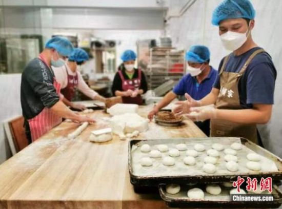 臺(tái)山市臺(tái)城美源餅屋的師傅們?cè)谥谱鬈涳。李曉?攝