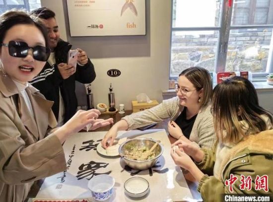 圖為外國留學(xué)生在山東煙臺學(xué)習(xí)包鲅魚水餃。 中新社記者 李長亮 攝