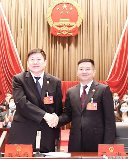 圖為市委書(shū)記賀志亮(左)和新當(dāng)選的市長(zhǎng)王吉握手