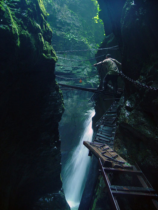 坐龍峽,經(jīng)由300萬年大自然的風(fēng)吹、水蝕而成,一直隱逸于湘西茫茫十萬群山之中。它長約3500米,最大高差達(dá)300余米;寬處不足丈余,窄處僅容一人通過;谷內(nèi)絕壁縱疊,溪瀑橫懸,崖樹斜逸,異草遍被。