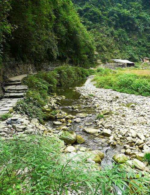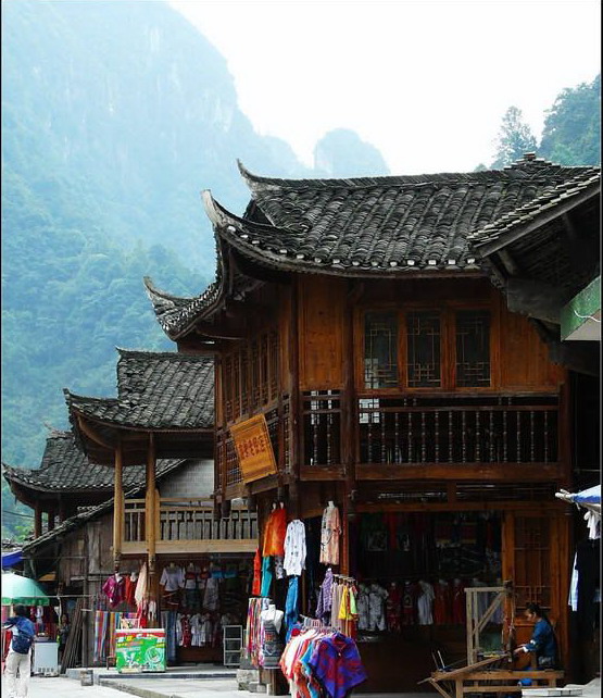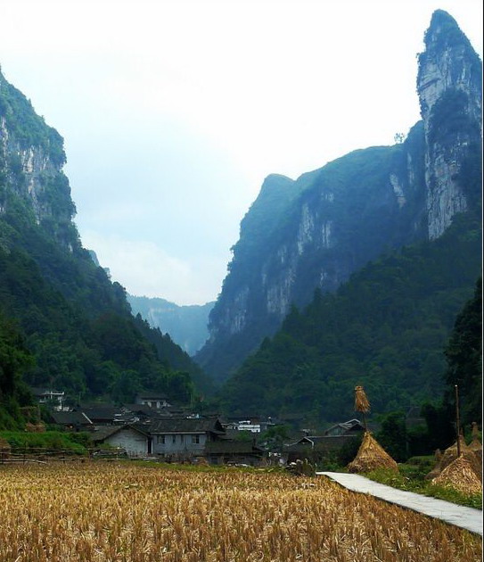 村寨四周山勢雄奇,絕壁夾天;“夯峽”、“九龍”、“玉泉”三溪在這里相會,如同三根彩帶在這里相交結。這里是風景區(qū)的中心,一萬五千多米長的青石板路從這里一直通向各個景點這里還是一個角度十分好的觀景臺,人立于此,只要原地轉動身子,就可觀賞到東西南北全方位的各個景點,那含情脈脈的“相依巖”、昂首奮蹄的“駟馬峰”、惟妙惟肖的“孔雀開屏”五彩繽紛的“彩云壁”和“畫屏峰”……盡在眼中無不景象萬千,令人目不瑕接。詩人石元機贊曰: