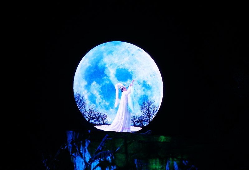 本項(xiàng)目舞臺及舞美設(shè)施為目前世界范圍內(nèi)的實(shí)景演出中投資最多、舞臺機(jī)械裝置最為復(fù)雜且規(guī)模最大、燈光設(shè)施數(shù)量最多且分布范圍最大的,另外主舞臺也是世界最大的全景玻璃鋼舞臺(10000平方米)。舞臺機(jī)械設(shè)施中,尤其是跨度60米、高度32米的伸縮飛橋,是目前世界范圍的演出項(xiàng)目中絕無僅有的大型舞臺機(jī)械裝置。燈光數(shù)量:大型燈光1100盞,中小型燈光2800盞;演出音響為專門定制的美國EAW音戶外防雨、防潮音響設(shè)備,也是目前國內(nèi)演出項(xiàng)目中投資最大的。