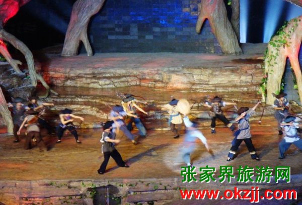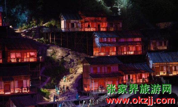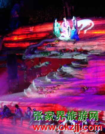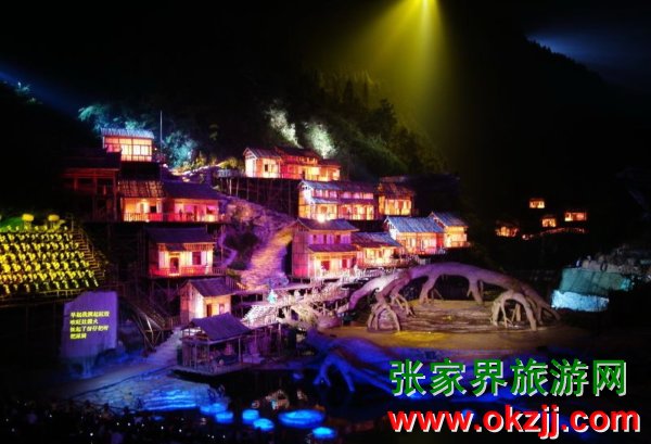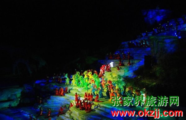 是目前世界第一臺有完整故事情節(jié)的山水實(shí)景音樂歌舞劇。舞臺選址在天門山風(fēng)景區(qū)山門口內(nèi)至天門山頂?shù)恼麠l峽谷,總投資達(dá)到1.2億元,演員隊(duì)伍達(dá)530多人。主舞臺以10000平米的玻璃鋼打造,是目前世界最大的全景玻璃鋼舞臺。