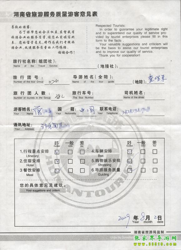 2009年7月31日湖南唐先生一行38人接待質量反饋單: