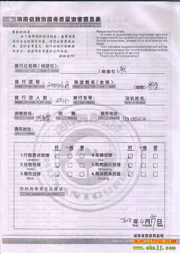 2010年4月22日鞏小姐一行2位旅游質(zhì)量反饋