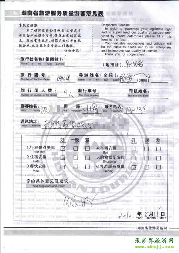 2010年8月15日無(wú)錫沈小姐一行9位旅游質(zhì)量反饋:很好