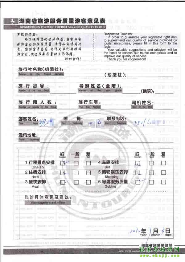 2010年9月9日沈小姐旅游質(zhì)量反饋