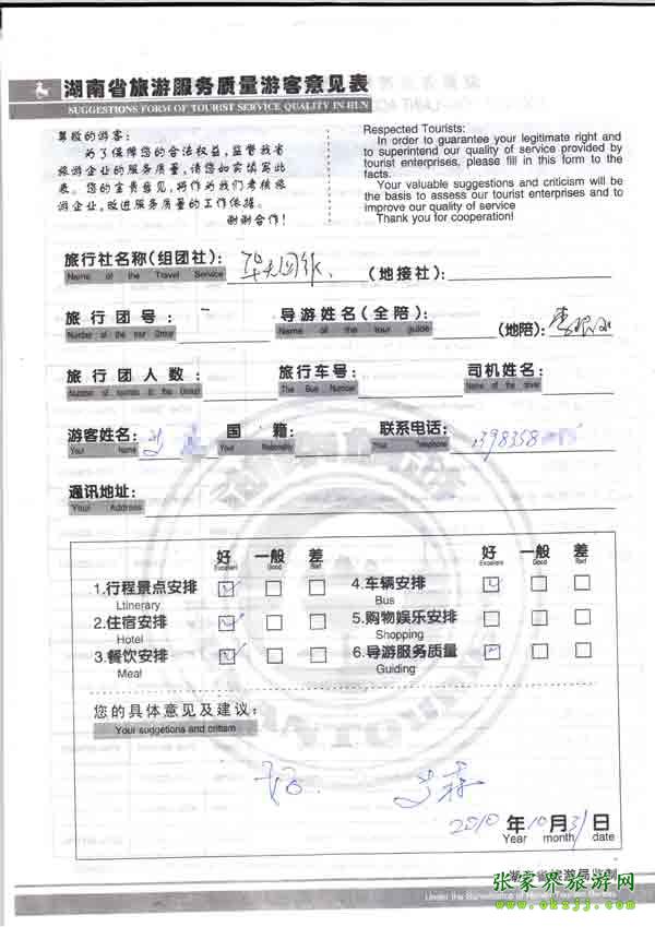 2010年10月31號(hào)艾先生旅游質(zhì)量反饋:好!