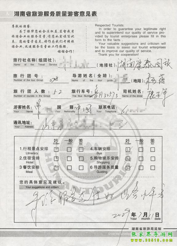 2009年7月11日山東曾先生一行52人質(zhì)量接待反饋單: