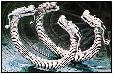 銀飾以其多樣的品種、奇美的造型和精巧的工藝,不僅向人們呈現(xiàn)了一個(gè)瑰麗多彩的藝術(shù)世界,而且也展示出一個(gè)有著豐富內(nèi)涵的精神世界。銀飾的種類較多,從頭到腳,無處不飾。除頭飾、胸頸飾、手飾、衣飾、背飾、腰墜飾外,個(gè)別地方還有腳飾。