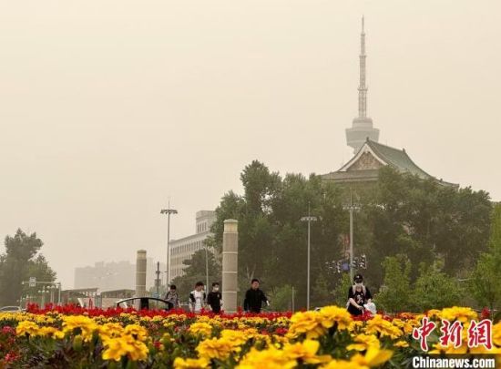 長春文化廣場雕塑!」选z市民在公園散步!」选z城市上空昏黃一片。 郭佳 攝沙塵天氣使能見度降低。 郭佳 攝城市綠樹被沙塵籠罩!」选z