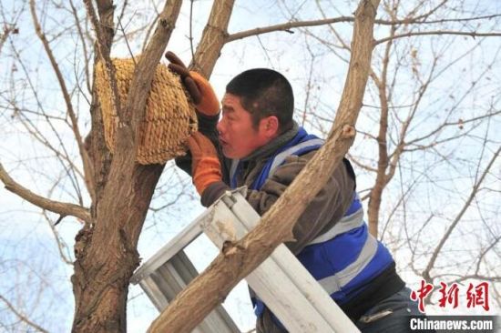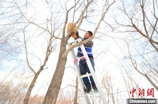 11月23日,趁著雪后天晴,吉林長(zhǎng)春友誼公園的工作人員忙著維護(hù)樹(shù)上的草編鳥(niǎo)巢,并投放了鳥(niǎo)糧。該公園生態(tài)環(huán)境好、野生鳥(niǎo)類多,園方已經(jīng)連續(xù)三年在園區(qū)設(shè)置百余個(gè)草編鳥(niǎo)巢助鳥(niǎo)類安全過(guò)冬。