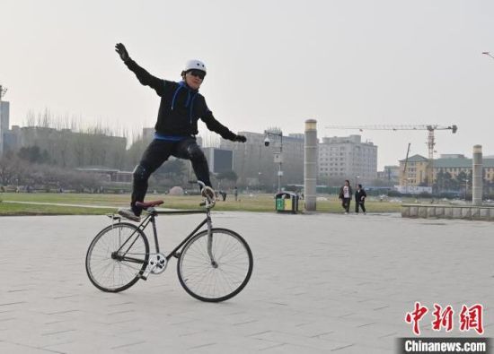 4月24日,在長春市文化廣場內(nèi),64歲的市民周長春表演自行車花樣絕技。站立騎行、脫把騎行等一系列驚險刺激的動作被周長春完成得十分精彩,吸引市民圍觀。