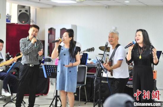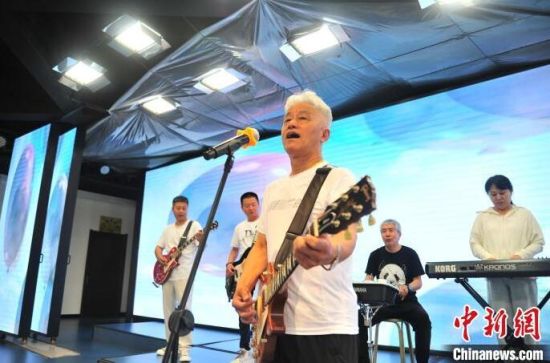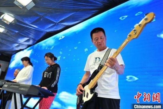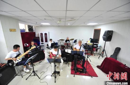 7月4日,吉林長(zhǎng)春,火焰老年樂(lè)隊(duì)在演奏搖滾樂(lè)。這支樂(lè)隊(duì)有7名樂(lè)手和7名主唱,平均年齡62歲,是吉林省為數(shù)不多的老年搖滾樂(lè)隊(duì)。他們?cè)诩ぐ旱臉?lè)聲中實(shí)現(xiàn)自己的搖滾夢(mèng),尋回年輕的感覺(jué)。