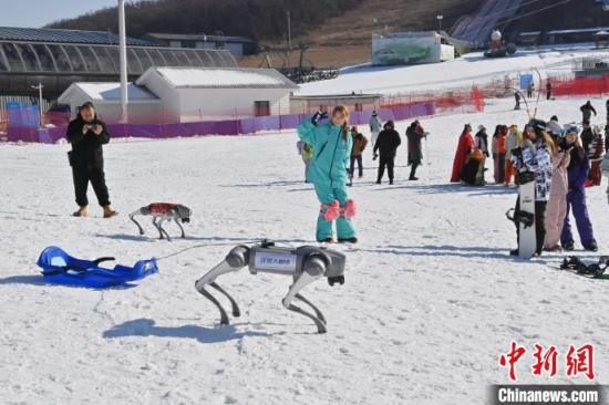 11月22日,在長春蓮花山滑雪場,機(jī)器狗在和小游客互動。當(dāng)天,長春蓮花山滑雪場開板,新上崗的6只機(jī)器狗憑借著新式“狗”拉爬犁出盡風(fēng)頭,惹得中外游客爭相合影。據(jù)悉,除了與游客互動,機(jī)器狗還能承擔(dān)物資運(yùn)送、急救和安全巡邏等多種服務(wù)任務(wù)。中新社記者 張瑤 攝