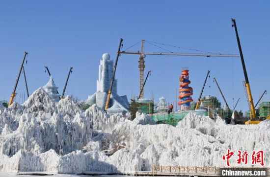 12月11日,吉林長春,工作人員正在長春冰雪新天地緊張施工。今年長春冰雪新天地總占地面積達到156萬平方米,冰雪雕塑200組創(chuàng)歷屆之最,并設置1314米的空中雪漂流、520米的冰滑梯等設施供中外游客游玩。中新社記者 張瑤 攝