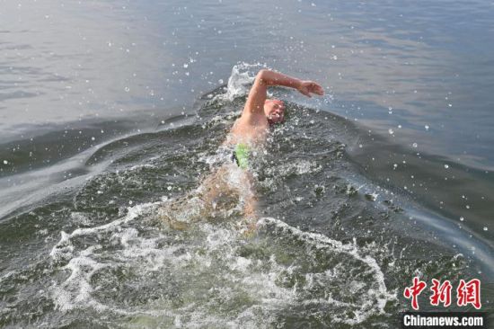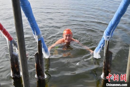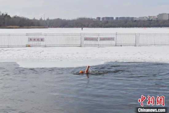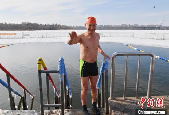 2月19日,在長(zhǎng)春南湖公園,吳長(zhǎng)海在冬泳。中新社記者 張瑤 攝