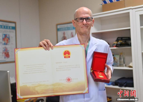 10月17日,吉林長(zhǎng)春,意大利醫(yī)生拉瓦若展示患者送他的錦旗。十年前,他作為國(guó)際志愿者與長(zhǎng)春結(jié)緣,被當(dāng)?shù)貙iT救助貧困心臟病患者的“吉心工程”所打動(dòng),決定留下。近日,他榮獲中國(guó)政府友誼獎(jiǎng)。他表示將繼續(xù)留在長(zhǎng)春,培育青年醫(yī)生、優(yōu)化診療體系,讓更多患者擁有“心跳的力量”。中新社記者 張瑤 攝